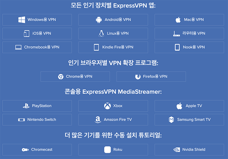 ExpressVPN을 활용할 수 있는 방법을 다양하게 제공하고 있다. 크롬 브라우저에 플러그인을 제공하거나, OS 전체에 영향을 미칠 수 있는 VPN 프로그램을 간단하게 이용할 수도 있도록 제공하고 있다.