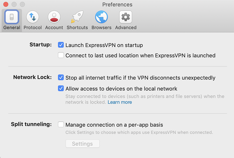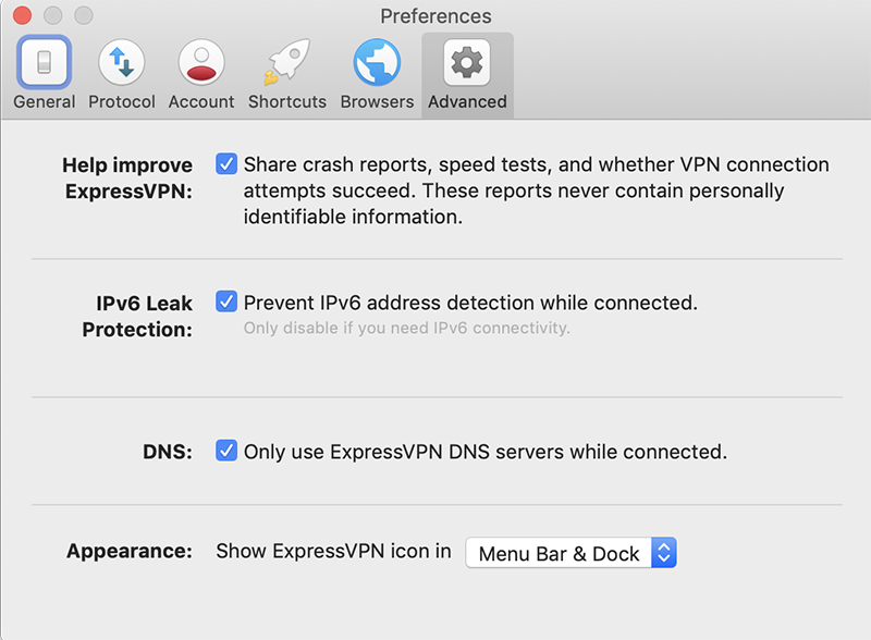 프로그램 설정은 간단하긴 하지만 옵션을 몇 가지 변경하면, IPv6 검색, 시스템 전역으로 이 VPN을 사용할지 여부 등을 정할 수 있다. 꼭 필요하다고 생각지 않다면 그냥 크롬 브라우저/파이어폭스에서 사용할 수 있는 ExpressVPN 확장 프로그램을 사용하는 게 좋아 보인다.