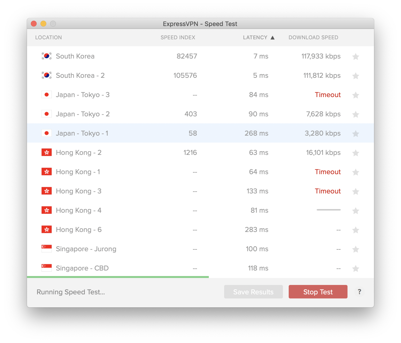 아래와 같이 Timeout 발생하는 경우도 있다. 이런 서버로는 현재 접근이 어려움을 알 수 있다. 그 외 속도 테스트를 하지 못하는 경우도 있다. 오래 걸리는 경우는 대부분 Timeout으로 넘어간다.
