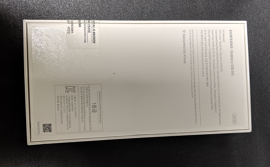 KT향 모델로 구입했고, 후면에는 갤럭시 S10 5G의 스펙이 간단하게 적혀있다.