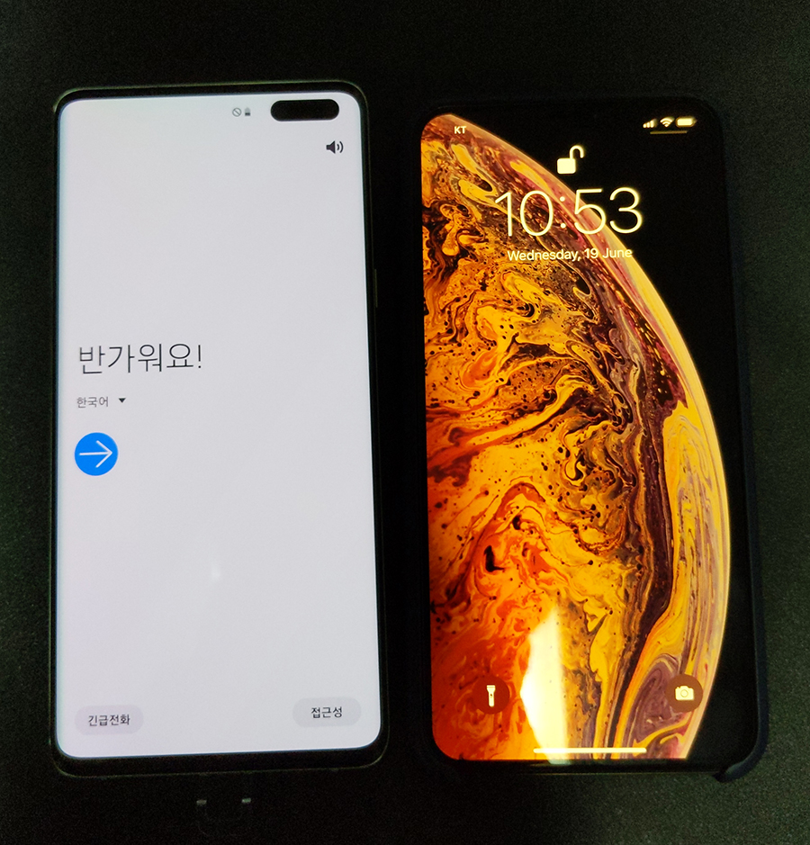 아이폰 XS Max와 한컷 찍어봤다. 액정이 훨씬 크지만 기기 자체의 무게는 (아이폰 XS Max 208g, 갤럭시 S10 5G 198g) 10g이 가볍다. 묵직한 감도 갤럭시가 덜해서 체감상 느껴지는 무게는 갤럭시가 훨씬 적다.