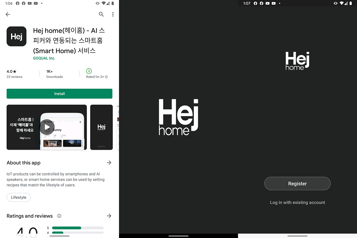 안드로이드 앱은 Play store에서 hej home 또는 헤이홈을 검색해 다운로드할 수 있다.