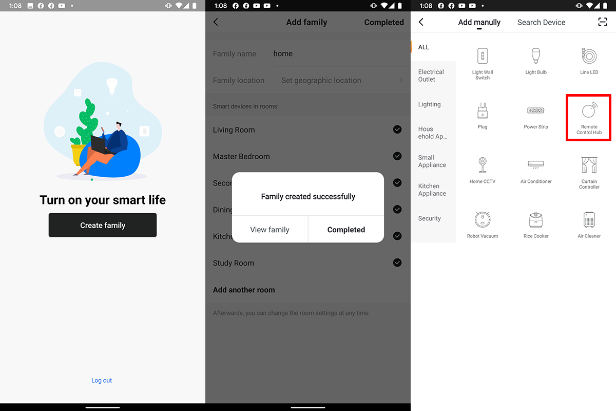 회원 가입이 완료되었다면, 내가 원하는 홈을 등록할 수 있다. 기본으로 제공하는 옵션 모두를 추가할 수도 있고, 원하는 방 정보만 지정할 수 있다. 그리고 나면 실제 사용할 Remote Control Hub를 찾아 등록을 할 수 있다.