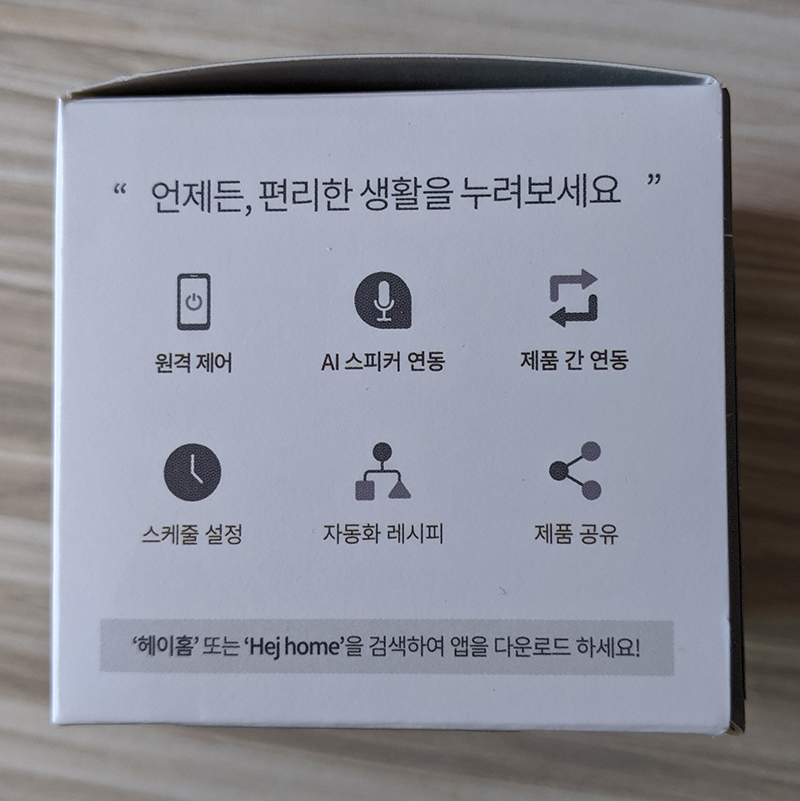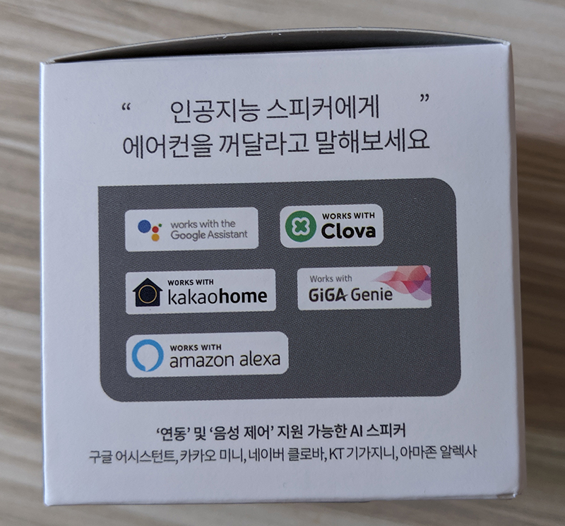 또 다른 측면에는 인공지능 스피커와 연결해 사용할 수 있는 가이드를 제공하는데, 구글 어시스턴트, 크로버, 카카오 홈, 기가 지니, 아마존 알렉사 까지 5개의 인공지능 스피커와 연동 가능하다.