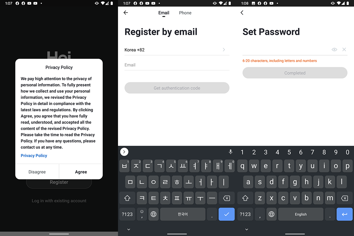 약관 동의를 받고, 특이하게 휴대폰 번호를 받아야 할 것처럼 생겼으나 국가 코드와 이메일을 받는다. 그리고 이메일 인증을 거치면 비밀번호 등록이 가능하다.
