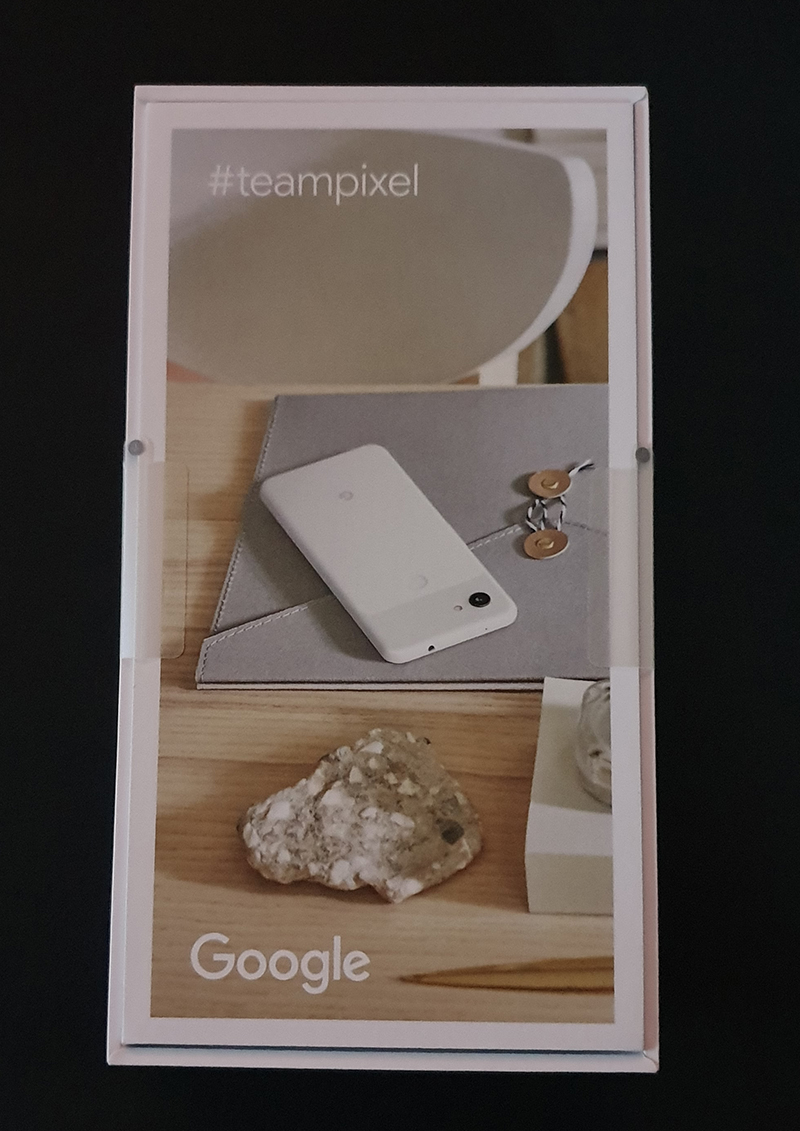 Pixel 3a의 박스 구성은 Pixel 3와 동일한 구성을 가지고 있다. 박스 전면엔 구글 로고와 후면을 프린팅 해두었다.