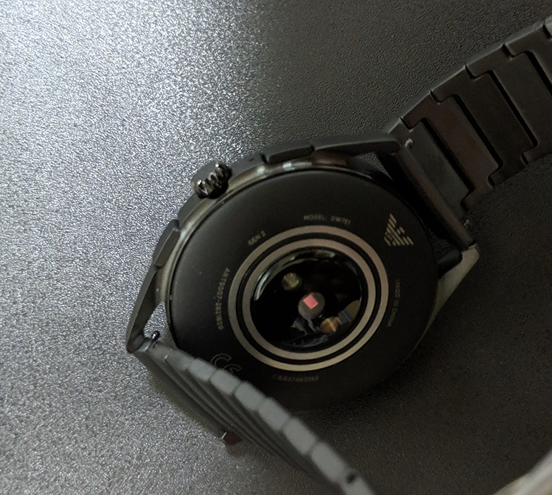 후면에 아르마니 로고와 가운데 심박측정 센서가 위치하고있다.