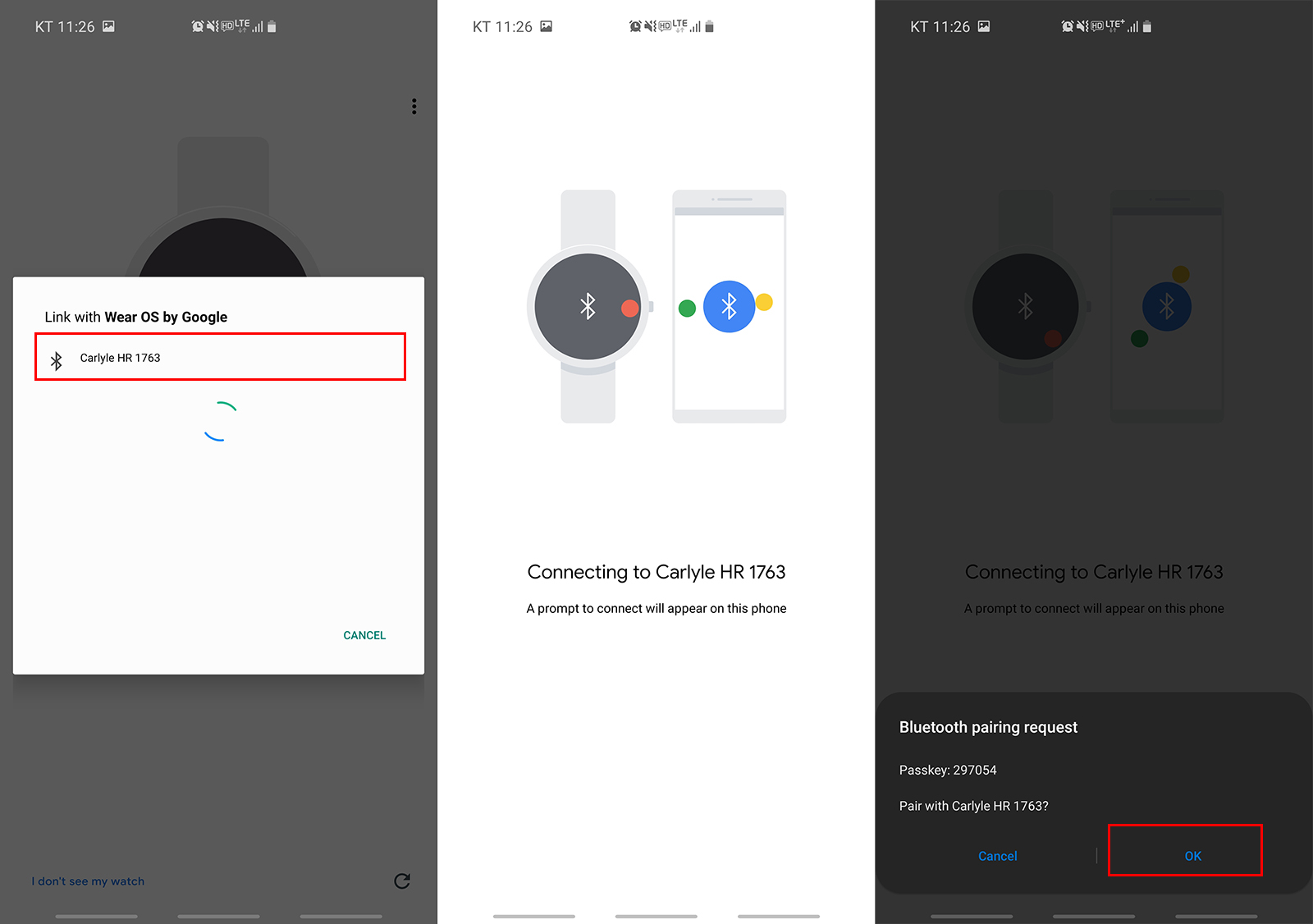 시계를 부팅하면 알림 영역에 바로 페어링 하겠냐고 표시되어 빠르게 페어링 시작이 가능하다.