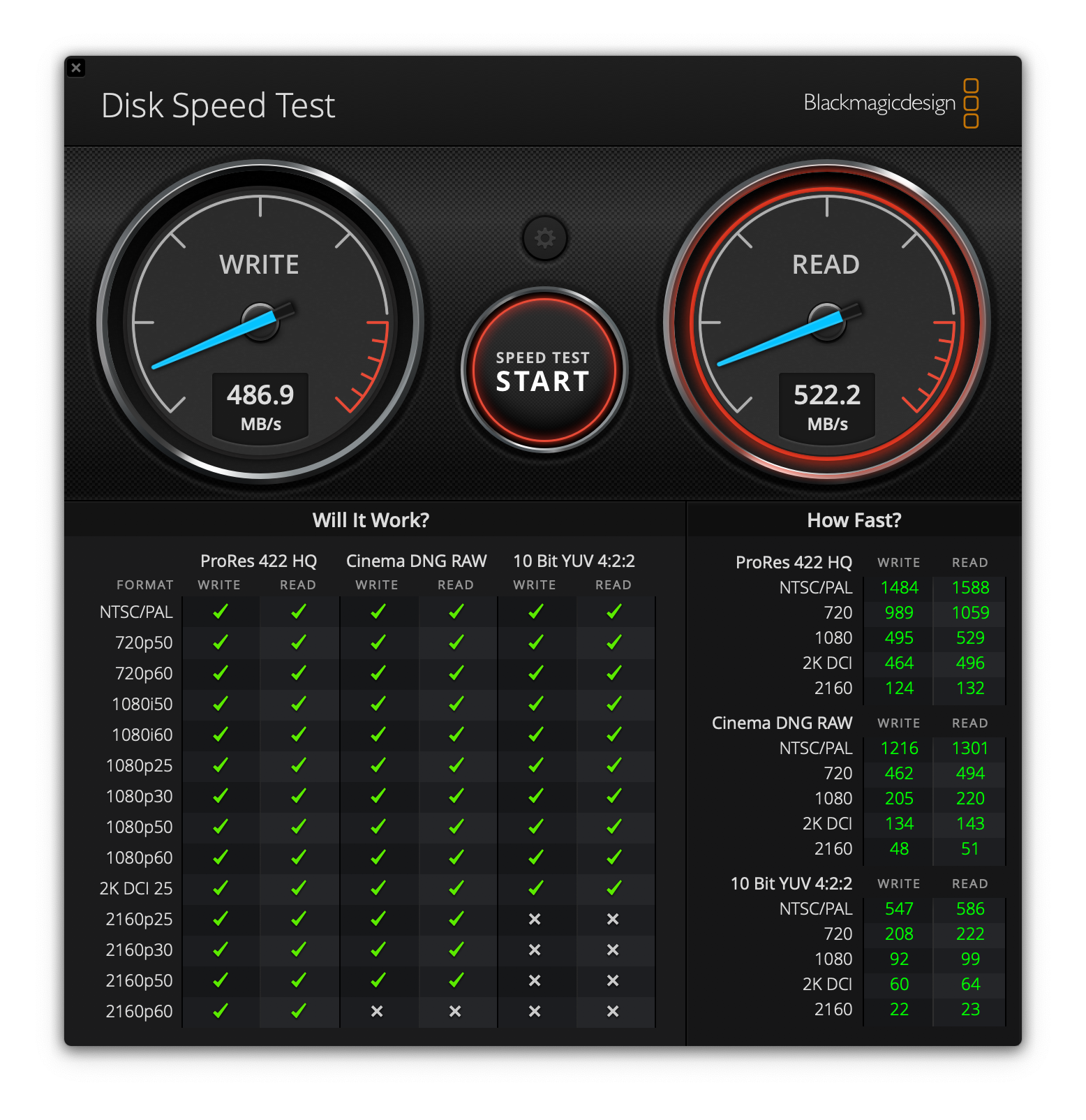 Disk Speed Test is an easy to use tool to quickly measure and certify your disk performance for working with high quality video! Simply click the start button and Disk Speed Test will write test your disk using large blocks of data, and then display the