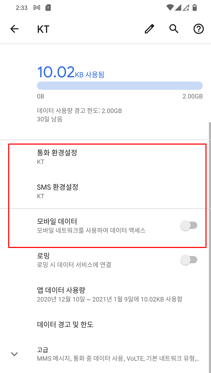 그리고 모바일 데이터는 on으로 변경한다.