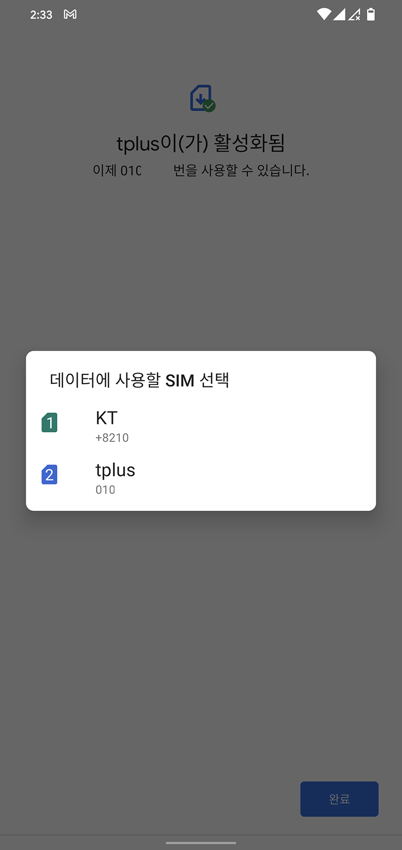 이러면 2개의 유심이 화면에 노출되고, 전화/문자는 tplus로 데이터는 kt로 선택되었다.