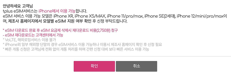 경고에도 쓰여있지만 eSIM을 등록 후 제거하거나, 휴대폰을 초기화하거나, 폰을 이동할 경우엔 무조건 2,750원을 청구 받는다.