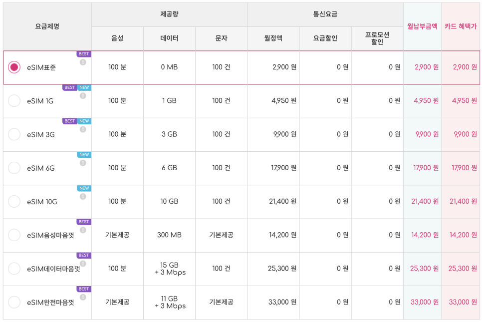 그 외에는 eSIM 후불 요금제를 가입하면 되겠다.