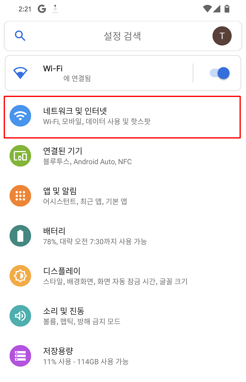 픽셀의 설정으로 이동하고, 네트워크 및 인터넷을 누른다.